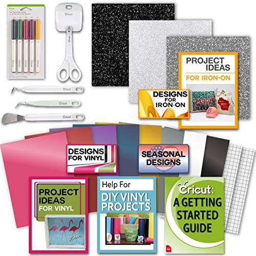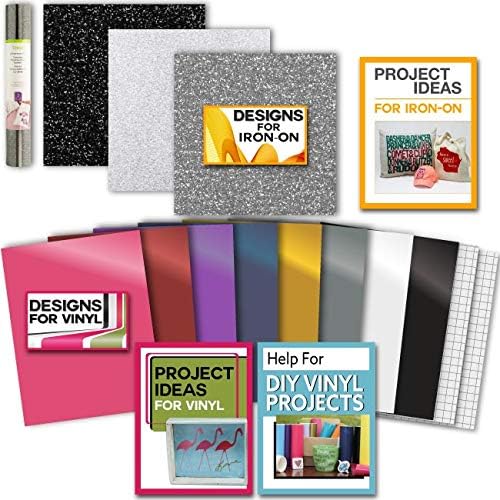 VINYL COMBO PACK: Includes (3) sheets of Cricut Glitter Iron-On Material (colors may vary), 12 exclusive digital Iron-On designs and a digital project tutorials. Vinyl pack includes (8) 9in x12in sheets Cricut adhesive vinyl, (2) 9in x12in sheets Transfer Tape, a digital copy of 12 exclusive digital vinyl designs with full digital project tutorials and a digital book about ways to use vinyl. Use the combo pack to make a variety of custom T-Shirt decals and home decor decals.