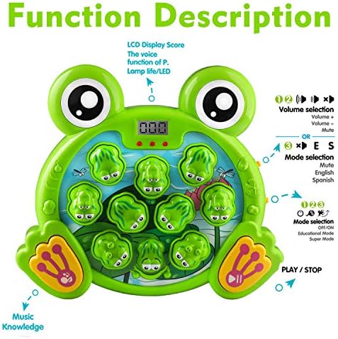 MULTIPLE FUNCTIONS: The frog have Two different game modes total of 38 different speed changing levels. The claw buttons on both sides can play music, comes with ‘real screams’ when you hit the frogs. The frogs light up and when you hit it, you get a point on the LCD counter, also include spoken words in four different languages can be chosen (English, Spanish, Russian and Portuguese). which can aid learning and musical sounds.
